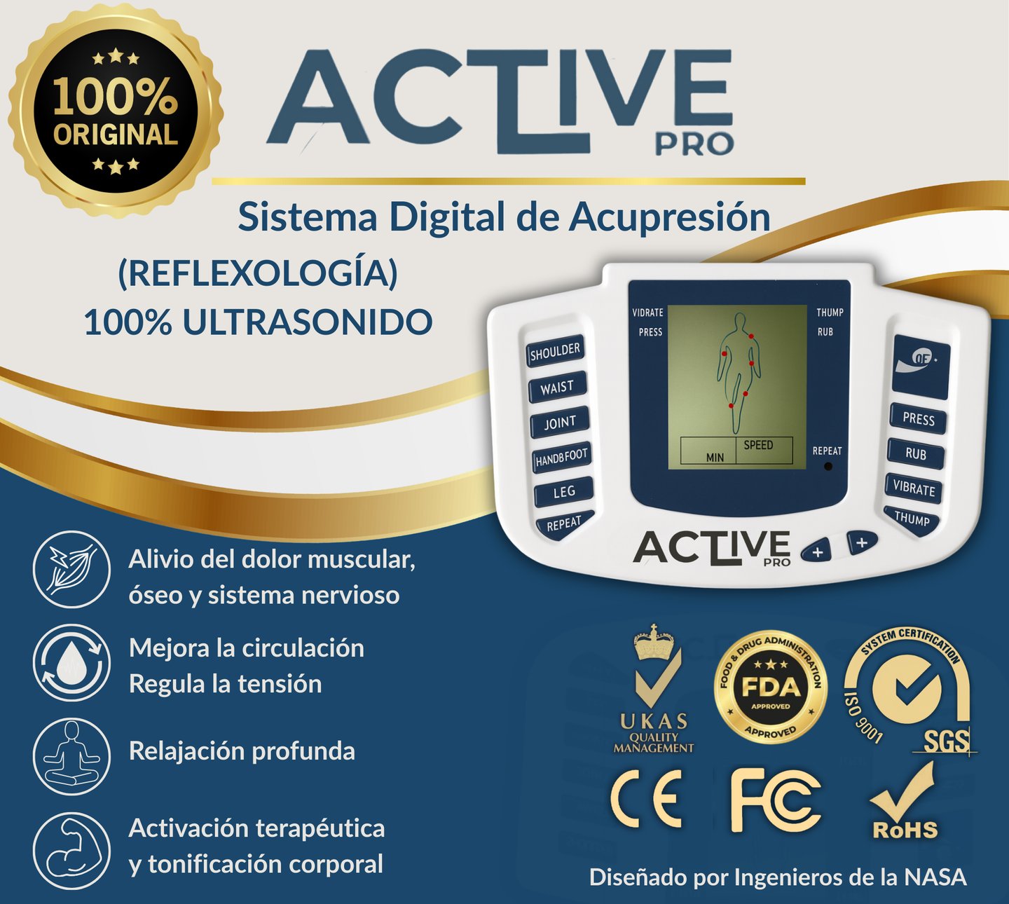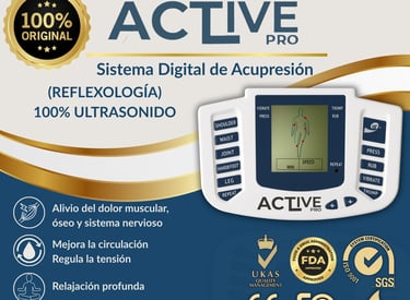 Active Live Pro es un equipo de terapia física que utiliza pulsos ultrasónicos digitales para estimular los sistemas del cuerpo, aliviar dolores musculares y activar un proceso de desintoxicación profunda.
